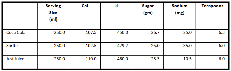 If we take drinks such as Coca Cola, Sprite, and Just Juice and normalise the serving sizes to 250 ml or approximately one glass, then in the table below we see that one glass of either beverage provides around 100 calories per glass. (Note: beware of serving sizes and the sizes of the containers that your drink or food comes in. 200-250 ml is an appropriate serving size for drinks, but the Coca Cola bottle we gathered our nutritional information from was 600 ml and that was considered to be one serving.)